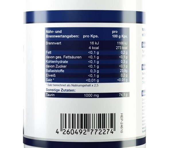 Die Health+ Taurin Kapseln enthalten pro Kapsel 1000 mg Taurin und können als Nahrungsergänzungsmittel einige Vorteile mit sich bringen. Taurin ist eine für erwachsene Menschen nicht-essentielle Aminosäure, genauer gesagt eine Aminoethansulfonsäure, die hauptsächlich beim Abbau von Cystein und Methionin (beide schwefelhaltig) entsteht. 1824 wurde sie erstmals aus einer Ochsengalle extrahiert und isoliert, weswegen sie auch den Namen Taurin bekam, was aus der griechischen Bezeichnung Tauros (=Stier) abgeleitet wurde. Eine Zufuhr über die Nahrung oder ein Supplement ist bei Erwachsenen nicht zwingend notwendig, da der erwachsene Körper Taurin bis zu einer Menge von circa 130mg täglich selbst synthetisieren kann. Taurin-Kapseln sind aber dennoch in bestimmten Situationen zu empfehlen.