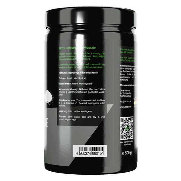 Das Zec+ Creatin Monohydrate ist ein Supplement, das als Shake einmal täglich zu sich genommen wird und ein leichtes Sättigungsgefühl hinterlässt. Creatin, auch unter der Schreibweise Kreatin bekannt, erhöht die körperliche Leistung bei Schnellkrafttraining im Rahmen kurzzeitiger intensiver körperlicher Betätigung. Der Stoff, der in unserem Shop als Monohydrat und als Pulver erhältlich ist, wird im Muskel in ATP (Adenosintriphosphat) umgewandelt. ATP ist die Energiequelle des Muskels, ohne die es ihm nicht möglich ist eine Bewegung auszuführen. Zwar kommt der Stoff auch in Fleisch und Fisch vor, allerdings lässt sich damit der Speicher im Körper nie vollständig füllen und den täglichen Kreatinbedarf nie vollständig decken, weshalb empfohlen wird, vor allem bei starker muskulärer Beanspruchung (Krafttraining) täglich 3 g Creatin zusätzlich einzunehmen. Mit dem ZEC+ Creatinpulver gelingt das im Handumdrehen. Da Kreatin ansonsten gut vom Körper aus der Nahrung synthetisiert werden kann, ist eine höhere Dosierung nicht nötig.