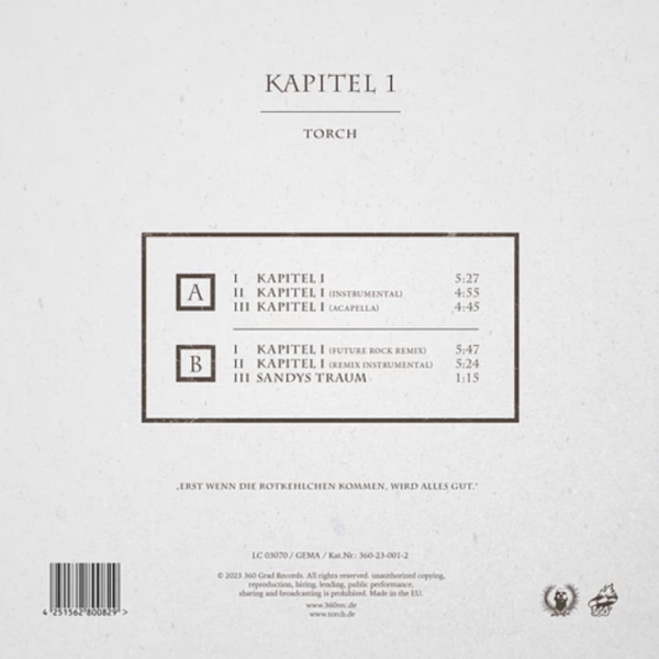 Kapitel 1 von Torch ist nicht irgendein Track. Kapitel 1 ist ein Monument, ein Manifest, ein Ausrufezeichen! Kurz: einer der ersten Meilensteine einer damals noch jungen Hip-Hop-Szene in Deutschland. Zahllose Vocal-Cuts und Zitate auf Tracks anderer Künstler sind der Beleg für den Einfluss und die Relevanz von Kapitel 1. Schon bei Erstveröffentlichung auf dem „Alte Schule“ Sampler (MZEE Records) Ende 1993 stach der Titel in vielerlei Hinsicht heraus – und gilt als unbestrittenes Highlight eines mit Highlights gepflasterten Klassikers.